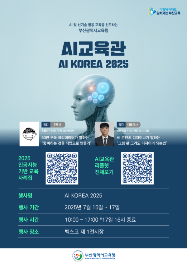 부산시교육청(교육감 김석준)은 오는 15일부터 17일까지 부산 벡스코 제1전시장에서 열리는 'K-ICT WEEK in BUSAN 2025'에서 전국 최대 규모의 'AI 교육관'을 운영한다고 14일 밝혔다.