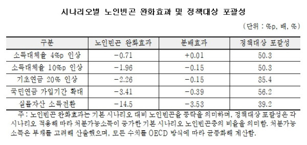노후소득 보장효과도 미미하다. 본지가 김학주 동국대 사회복지학과 교수, 김신영 한양사이버대 실버산업학과 교수와 통계청 가계금융복지조사 및 가계동향조사 마이크로데이터를 활용해 연금제도 개혁이 노인빈곤 완화에 미치는 영향을 분석한 결과, 국민연금 소득대체율을 4%p 올려도 노인빈곤율 개선효과는 0.71%p에 불과한 것으로 나타났다. 처분가능소득 5분위 배율(5분위 배율) 개선효과는 없었다. 10%p 인상해도 노인빈곤율 완화효과는 1.96%p, 5분위 배율 개선효과는 0.15배에 그쳤다. 사각지대(49.7%)가 광범위하고, 국민연금 수급자인 노인빈곤층 대다수가 짧은 가입기간으로 소득대체율 인상에 따른 급여액 증가가 미미해서다.