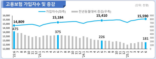 고용노동부는 14일 발표한 '6월 고용행정 통계로 본 노동시장 동향'에서 지난달 말 기준 고용보험 상시가입자(상시·임시직)가 1559만 명으로 전년 동월보다 18만1000명 증가했다고 밝혔다. 고용보험 가입자 증가 폭은 4월 18만4000명, 5월 18만7000명, 지난달 18만1000명으로 3개월째 18만 명대에서 정체돼 있다.