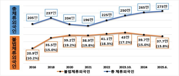 앞서 법무부는 올해 4월 14일부터 지난달 29일까지 77일간 출입국관리법 위반 사범에 관한 정부 합동 단속을 실시, 불법 체류 외국인 1만1253명을 적발했다. 이 가운데 9525명은 강제 퇴거 등 출국 조치를, 1728명은 범칙금 처분 등을 각각 내렸다.