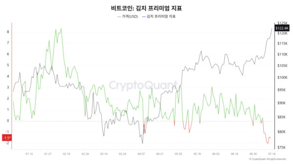 비트코인이 글로벌 시장에서 사상 최고치를 경신하는 가운데 국내 시장만 유독 가라앉은 상황이다. 14일 오후 2시 30분 기준 글로벌 가상자산 시황 중계사이트 코인마켓캡에 따르면 비트코인은 전일 대비 3.57% 상승한 12만2069달러에 거래되고 있다. 12만2000달러를 넘은 건 사상 처음이다. 역프리미엄 현상은 올해 2월 김치프리미엄이 8%를 웃돌았던 것과는 대조적이다.