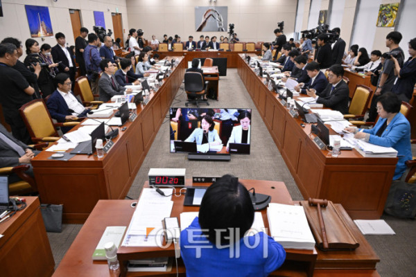 ▲14일 서울 여의도 국회 과학기술정보방송통신위원회에서 열린 배경훈 과학기술정보통신부 장관 후보자 인사청문회에서 최민희 위원장과 최형두 국민의힘 과방위 간사가 대화를 하고 있다. 조현호 기자 hyunho@