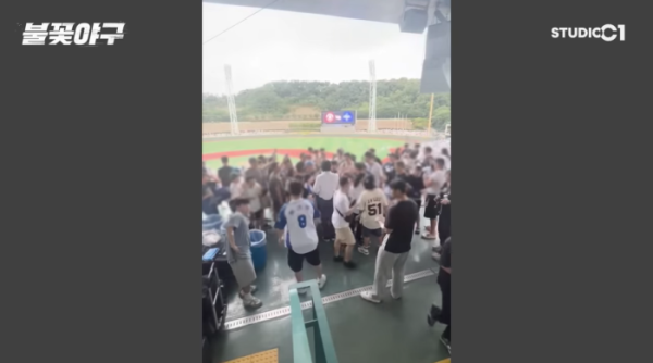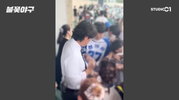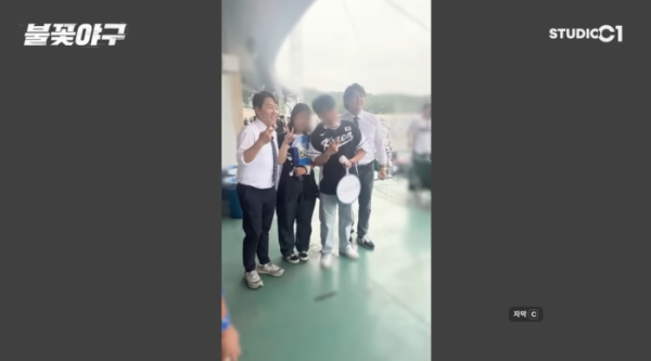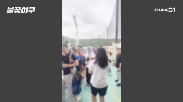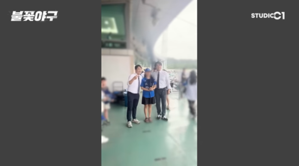 공개된 영상에는 13일 울산 문수 야구장에서 펼쳐진 불꽃 파이터즈와 강릉고와의 경기 현장에서 김선우 해설위원, 정용검 캐스터와 사진을 찍기 위해 줄을 서 있는 팬들의 모습이 담겼다.
