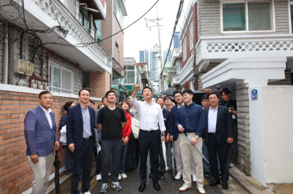 ▲오세훈 서울시장이 14일 서울 광진구 자양4동 신속통합기획 재개발 현장을 찾아 사업대상지 환경과 정비시 개선사항 등을 점검하고 있다. 신태현 기자 holjjak@