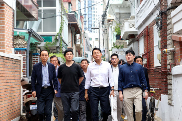 오세훈 서울시장이 14일 서울 광진구 자양4동 신속통합기획 재개발 현장을 찾아 마을 주민들과 간담회를 가진 뒤 사업대상지 환경과 정비시 개선사항 등을 점검했다.