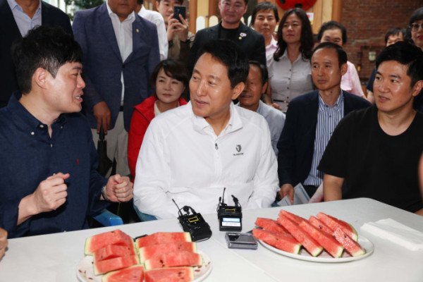 ▲오세훈 서울시장이 14일 서울 광진구 자양4동 신속통합기획 재개발 현장을 찾아 사업대상지 환경과 정비시 개선사항 등을 점검하기 앞서 마을 주민들과 간담회를 갖고 있다. 신태현 기자 holjjak@