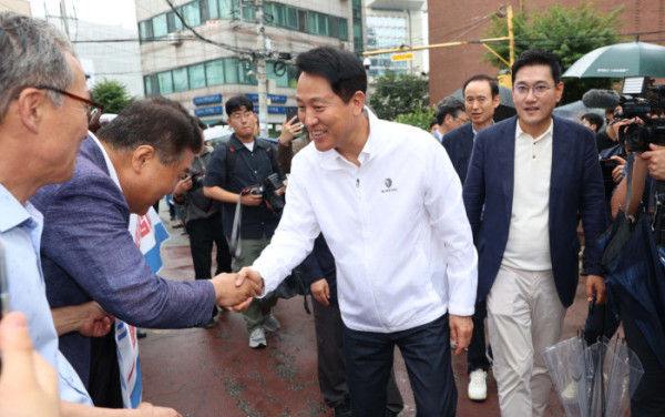 ▲오세훈 서울시장이 14일 서울 광진구 자양4동 신속통합기획 재개발 현장을 찾아 사업대상지 환경과 정비시 개선사항 등을 점검하기 앞서 마을 주민들과 인사하고 있다. 신태현 기자 holjjak@