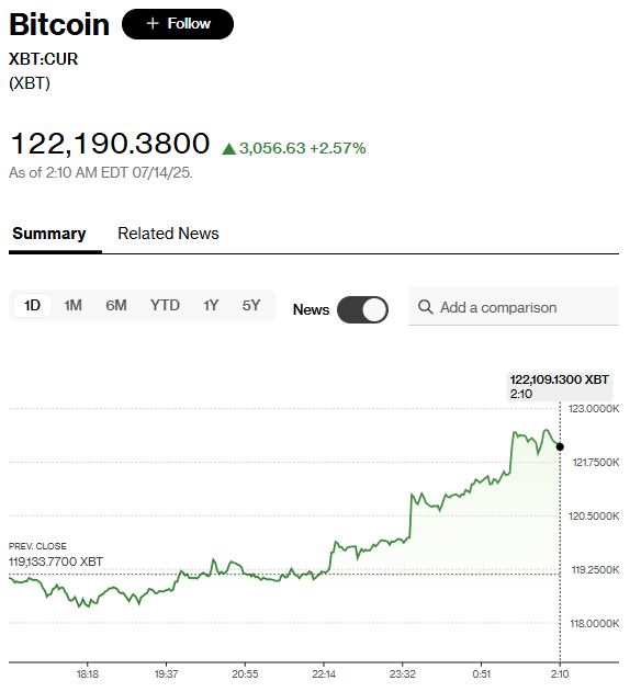 블룸버그통신에 따르면 이날 오후 2시 20분께 비트코인 가격은 24시간 전보다 약 2.57% 상승한 12만2190달러를 기록했다.
