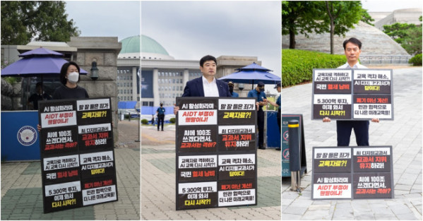 인공지능 디지털교과서(AIDT)의 법적 지위를 '교육자료'로 낮추는 정치권의 움직임과 관련해 AIDT 발행사와 교과서발전위원회 관계자들은 14일 국회와 용산 대통령실 앞에서 릴레이 시위에 나섰다. 15일 천재교과서 등에 따르면 발행사와 교육위원회는 국회가 충분한 논의를 거쳐 제도를 재설계해야 한다고 주장하고 있다.