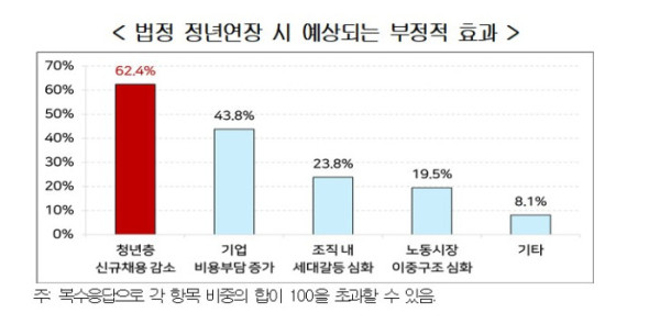 법정 정년을 65세로 연장할 경우 예상되는 부정적 효과에 대해 물은 결과 ‘청년층 신규채용 감소’라는 응답이 62.4%로 가장 높았다.