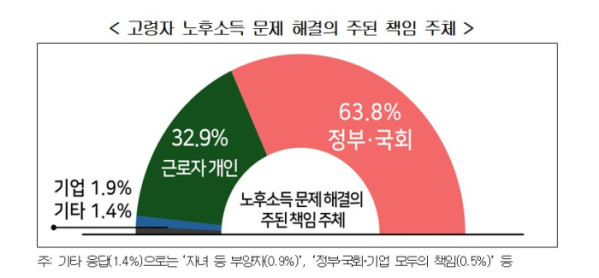 초고령사회에 대응해 고령자 노후소득 문제 해결의 주된 책임 주체를 묻는 질문에 ‘정부·국회’라는 응답이 63.8%, ‘근로자 개인’이라는 응답이 32.9%로 집계됐다. 반면, ‘민간기업’이라는 응답은 1.9%에 불과한 것으로 나타났다.