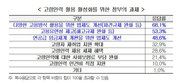 정부가 고령자 계속고용 정책을 추진할 경우 기업에 과도한 부담을 전가하는 방식은 적절하지 않다는 의미로 풀이된다.