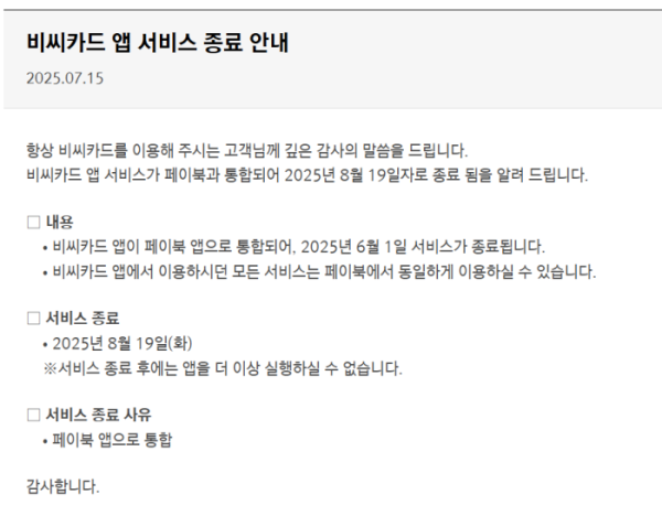BC카드는 15일 공지를 통해 "비씨카드 앱 서비스가 페이북과 통합돼 2025년 8월 19일자로 종료된다"고 밝혔다.