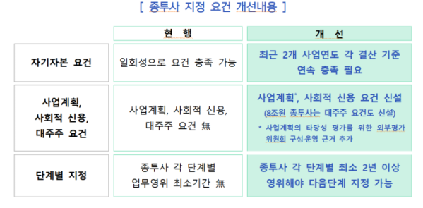 또 종투사는 사업계획과 사회적 신용을 심사받아야 하며, 종투사 각 단계별로 2년 이상 영위해야 다음 단계의 종투사 지정을 받을 수 있다. 8조 원 종투사 지정요건에는 변경인가 수준의 대주주 요건을 신규로 도입한다.