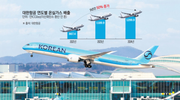 전 세계적으로 ‘하늘길 탈탄소’ 추세가 확산하는 가운데 대한항공의 온실가스 배출량이 최근 3년 사이 50% 가까이 증가한 것으로 나타났다. 팬데믹 이후 급증한 항공 수요와 화물 운항 증가에 따른 결과로 풀이된다. 대한항공은 지속가능항공유(SAF) 사용 확대와 함께 2032년까지 연료효율이 개선된 신기재 항공기 149대를 투입할 계획이다.
