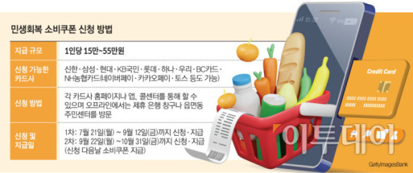민생회복 소비쿠폰은 이달 21일 오전 9시부터 온·오프라인으로 신청이 가능하다. 신용·체크카드, 선불카드, 지역사랑상품권 중 원하는 방식을 선택할 수 있다. 1차로 15만~45만 원 상당의 소비쿠폰을 소득별로 차등 지급하고, 2차로는 국민 90%를 대상으로 10만 원을 추가 지급한다.