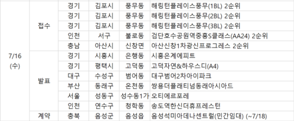 또 경기 김포시 '해링턴플레이스풍무(1~3BL)'와 인천 '검단호수공원역중흥S클래스(AA24)', 충남 아산시 '아산신창1차광신프로그레스'의 2순위 청약 접수는 이날 진행된다.