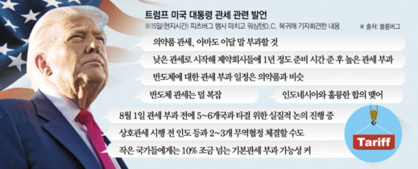 15일(현지시간) 블룸버그통신에 따르면 트럼프 대통령은 의약품과 반도체에 대한 관세가 다음 달 1일부터 발효될 광범위한 상호관세와 함께 적용될 가능성을 시사했다.
