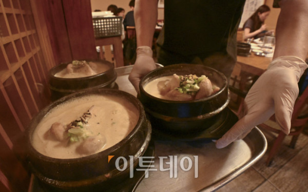 ▲본격적인 더위가 시작하는 초복을 앞두고 최근 폭염으로 폐사하는 닭 급증과 수급 불안까지 겹치며 삼계탕 한 그릇 가격이 2만원을 육박하고 있다. 통계청 국가통계포털(KOSIS)에 따르면 6월 삼계탕 품목의 소비자물가지수는 122.56으로 지난 2020년에 비해 약 22% 상승했다. 한국소비자원 가격정보포털 참가격은 5월 서울 지역 삼계탕 한 그릇 평균 가격을 1만7654원으로 전년대비 4.6% 올랐다고 밝혔다. 16일 서울 시내 한 삼계탕 전문식당에서 직원이 삼계탕을 서빙하고 있다. 조현호 기자 hyunho@