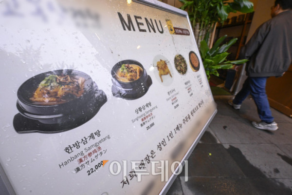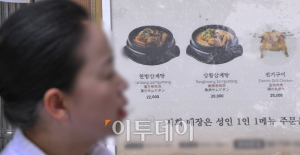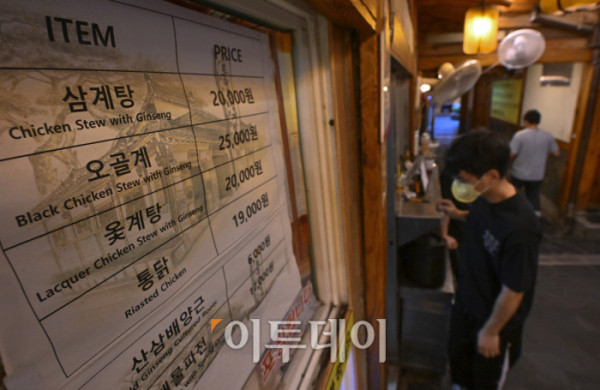 ▲본격적인 더위가 시작하는 초복을 앞두고 최근 폭염으로 폐사하는 닭 급증과 수급 불안까지 겹치며 삼계탕 한 그릇 가격이 2만원을 육박하고 있다. 통계청 국가통계포털(KOSIS)에 따르면 6월 삼계탕 품목의 소비자물가지수는 122.56으로 지난 2020년에 비해 약 22% 상승했다. 한국소비자원 가격정보포털 참가격은 5월 서울 지역 삼계탕 한 그릇 평균 가격을 1만7654원으로 전년대비 4.6% 올랐다고 밝혔다. 16일 서울 시내 한 삼계탕 전문식당에 삼계탕 가격이 2만원을 가리키고 있다. 조현호 기자 hyunho@