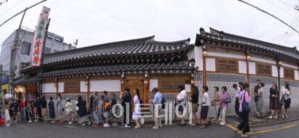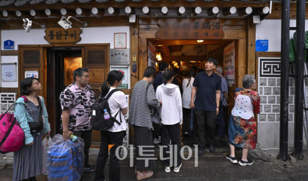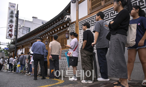 ▲본격적인 더위가 시작하는 초복을 앞두고 최근 폭염으로 폐사하는 닭 급증과 수급 불안까지 겹치며 삼계탕 한 그릇 가격이 2만원을 육박하고 있다. 통계청 국가통계포털(KOSIS)에 따르면 6월 삼계탕 품목의 소비자물가지수는 122.56으로 지난 2020년에 비해 약 22% 상승했다. 한국소비자원 가격정보포털 참가격은 5월 서울 지역 삼계탕 한 그릇 평균 가격을 1만7654원으로 전년대비 4.6% 올랐다고 밝혔다. 16일 서울 시내 한 삼계탕 전문식당 앞에서 시민들이 식사를 하기 위해 길게 줄을 서서 대기하고 있다. 조현호 기자 hyunho@