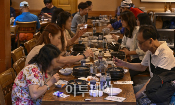 ▲본격적인 더위가 시작하는 초복을 앞두고 최근 폭염으로 폐사하는 닭 급증과 수급 불안까지 겹치며 삼계탕 한 그릇 가격이 2만원을 육박하고 있다. 통계청 국가통계포털(KOSIS)에 따르면 6월 삼계탕 품목의 소비자물가지수는 122.56으로 지난 2020년에 비해 약 22% 상승했다. 한국소비자원 가격정보포털 참가격은 5월 서울 지역 삼계탕 한 그릇 평균 가격을 1만7654원으로 전년대비 4.6% 올랐다고 밝혔다. 16일 서울 시내 한 삼계탕 전문식당에서 시민들이 식사를 하고 있다. 조현호 기자 hyunho@