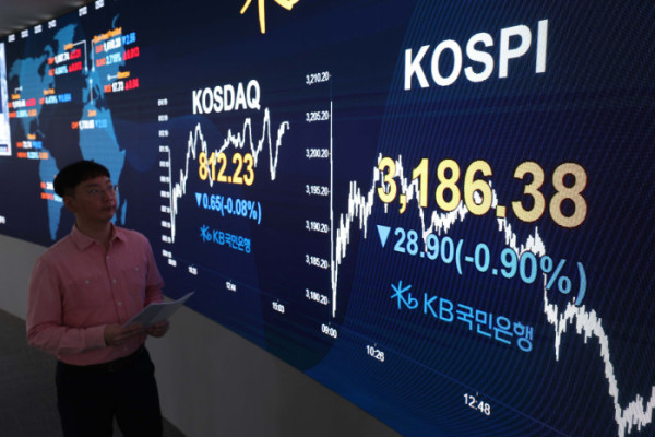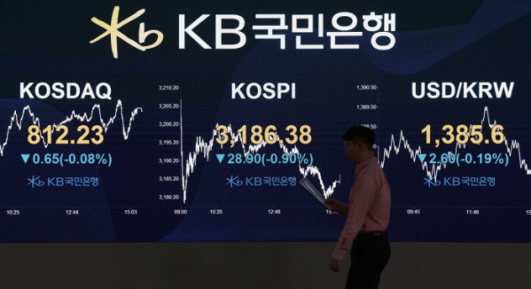 연중 최고점 경신을 이어가던 코스피가 미국 물가에 대한 우려에 하루만에 3200선을 내주며 마감했다. 16일 서울 여의도 KB국민은행 스마트딜링룸 모니터에 코스피 종가가 표시되고 있다. 이날 코스피는 전거래일 대비 28.90p(0.90%) 내린 3186.38에 장을 마쳤다.