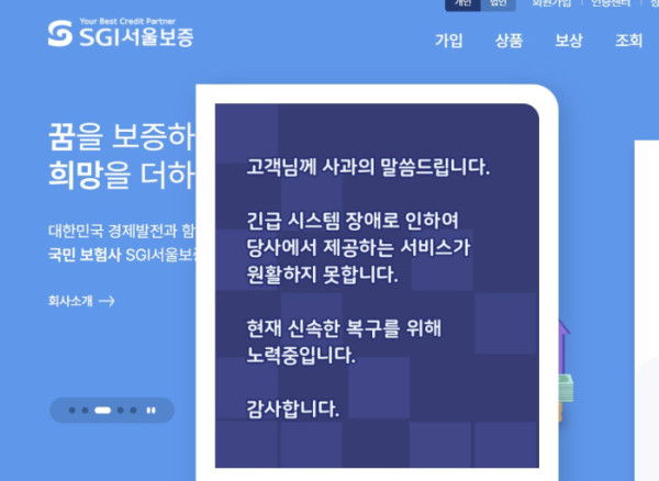 ▲랜섬웨어 공격 여파로 6월 16일 SGI서울보증 웹사이트에 긴급 시스템 장애 안내문이 게시되어 있다. (사진제공=SGI서울보증)