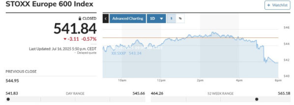 ▲스톡스유럽600지수 16일(현지시간) 541.84 마감 (마켓워치 )