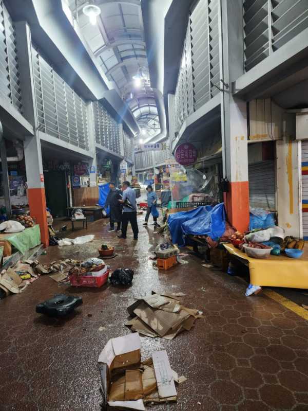 ▲17일 새벽 충남 태안에 200㎜ 넘는 물 폭탄이 쏟아진 가운데 한때 물에 잠겼던 태안 서부시장이 아수라장으로 변해 있다. (사진제공=태안군)