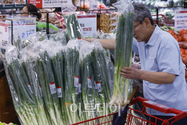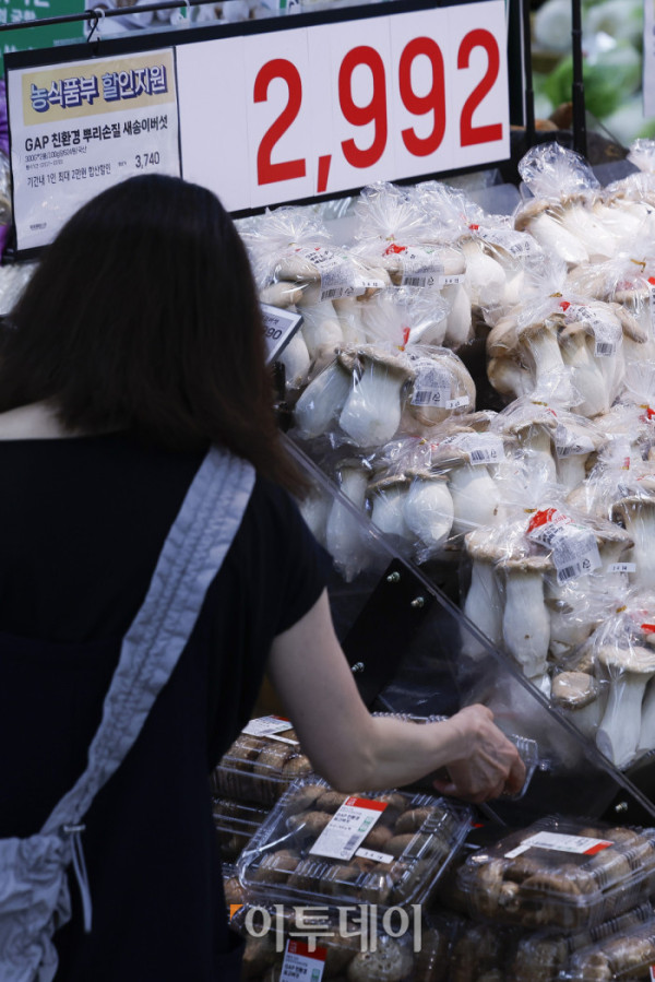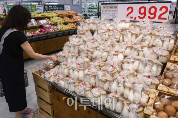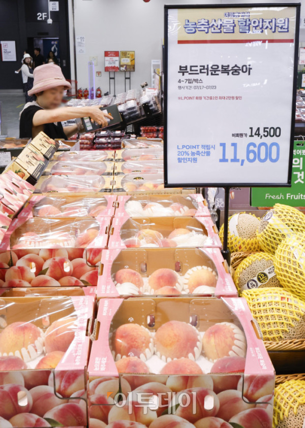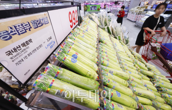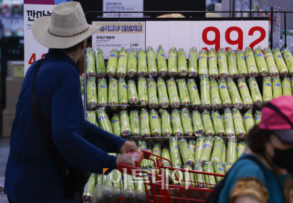 ▲대형마트 3사가 농림축산식품부와 손잡고 밥상 물가 내리기에 나선다. 17일 대형마트업계 및 농림축산식품부에 따르면 이마트·홈플러스·롯데마트는 이날부터 여름 제철 과일이나 필수 채소의 가격을 낮추는 '농축산물 할인지원(농할)' 행사를 진행한다. 이마트는 3주간 배추 등 농산물을 신세계포인트 적립 시 자체 20% 할인가에 농식품부 지원 20%를 적용해 정상가보다 36% 싸게 판매한다. 롯데마트는 23일까지 농식품부와 제철 과일과 채소, 곡류 등 15개 품목을 할인한다. 1인당 최대 2만원까지 할인을 받을 수 있다. 홈플러스는 마이홈플러스 멤버특가 할인에 농할쿠폰 20% 추가 할인 혜택을 제공한다. 이날 서울 시내 한 롯데마트에서 시민들이 장을 보고 있다. 조현호 기자 hyunho@