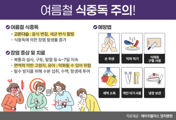 장마철 습도가 높고 낮 최고기온이 35℃ 이상 지속되는 기간에는 우리가 섭취하는 음식도 변질되기 쉽고 세균 번식도 활발해지면서 식중독에 의한 장염 발생률이 증가한다.