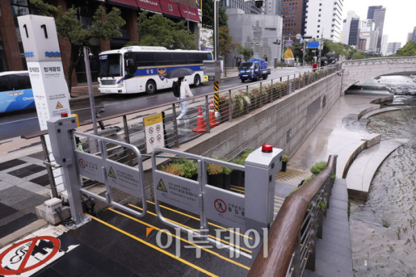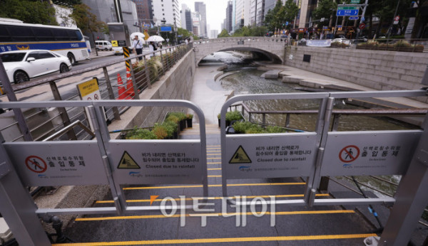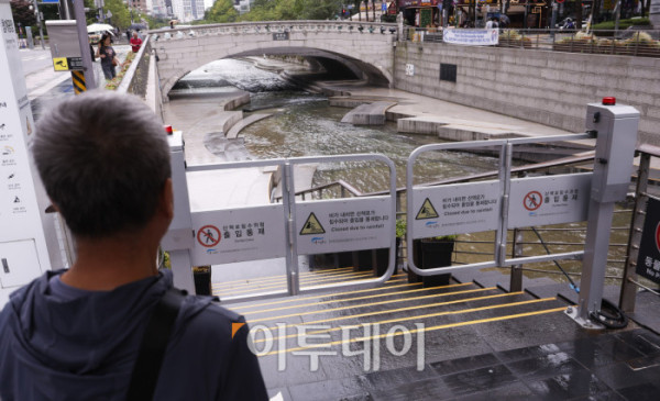 ▲전국 곳곳에서 강한 비가 내리며 침수와 하천 범람 등 호우 관련 피해가 발생한 17일 서울 청계천 출입이 통제되고 있다. 어제 오후 5시부터 서울 전역에 내려졌던 호우주의보는 이날 오전 해제됐다. 조현호 기자 hyunho@