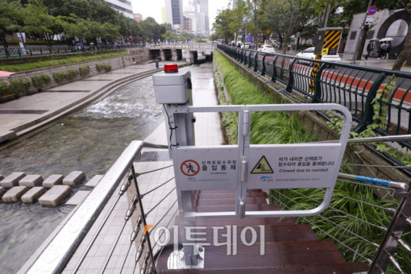 전국 곳곳에서 강한 비가 내리며 침수와 하천 범람 등 호우 관련 피해가 발생한 17일 서울 청계천 출입이 통제되고 있다. 어제 오후 5시부터 서울 전역에 내려졌던 호우주의보는 이날 오전 해제됐다. 조현호 기자 hyunho@