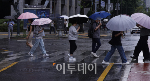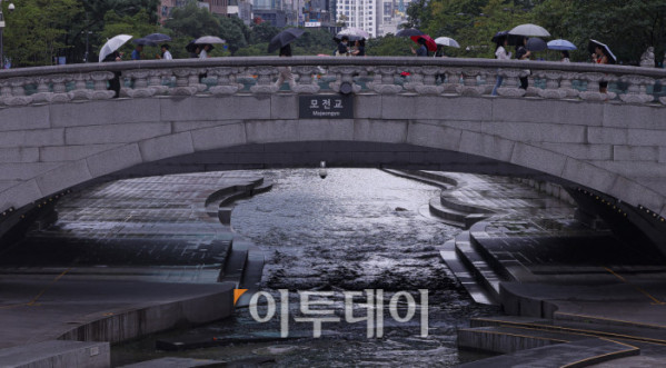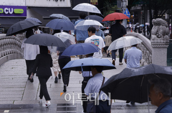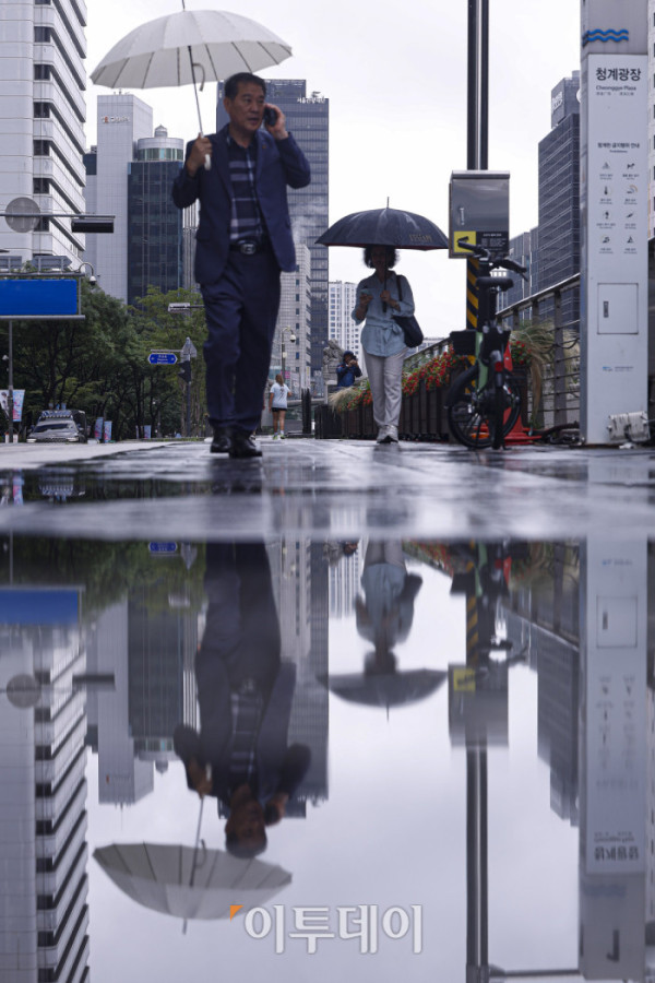 ▲전국 곳곳에서 강한 비가 내리며 침수와 하천 범람 등 호우 관련 피해가 발생한 17일 서울 청계천 일대에서 우산을 쓴 시민들이 비를 피해 발걸음을 재촉하고 있다. 어제 오후 5시부터 서울 전역에 내려졌던 호우주의보는 이날 오전 해제됐다. 조현호 기자 hyunho@
