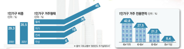 24일 본지가 지난해 말 국토교통부가 발표한 ‘2023년도 주거실태조사’를 분석한 결과 1인 가구 비중은 2018년 29.3%에서 2023년 35.5%로 증가했으며 이중 45%는 월세에 거주하고 있는 것으로 집계됐다. 자가(30%), 전세(19%), 무상(6%)을 크게 앞지르는 규모다.