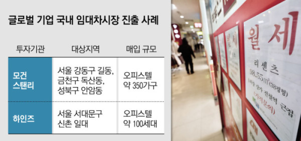 최근 국내 월세 시장 또한 확대되면서 글로벌 기업들이 국내 임대차 시장에 뛰어들고 있다. 세계 3대 투자은행 모건스탠리는 국내 부동산 운영사와 협력해 길동, 독산동, 안암동 지역 오피스텔 350여 실을 매입하면서 임대주택 시장에 뛰어들었다. 세계 3대 부동산 투자기업 중 하나인 미국계 디벨로퍼 하인즈 또한 서울 신촌 일대 100여 실의 오피스텔을 매입하면서 관련 사업을 준비 중이다.