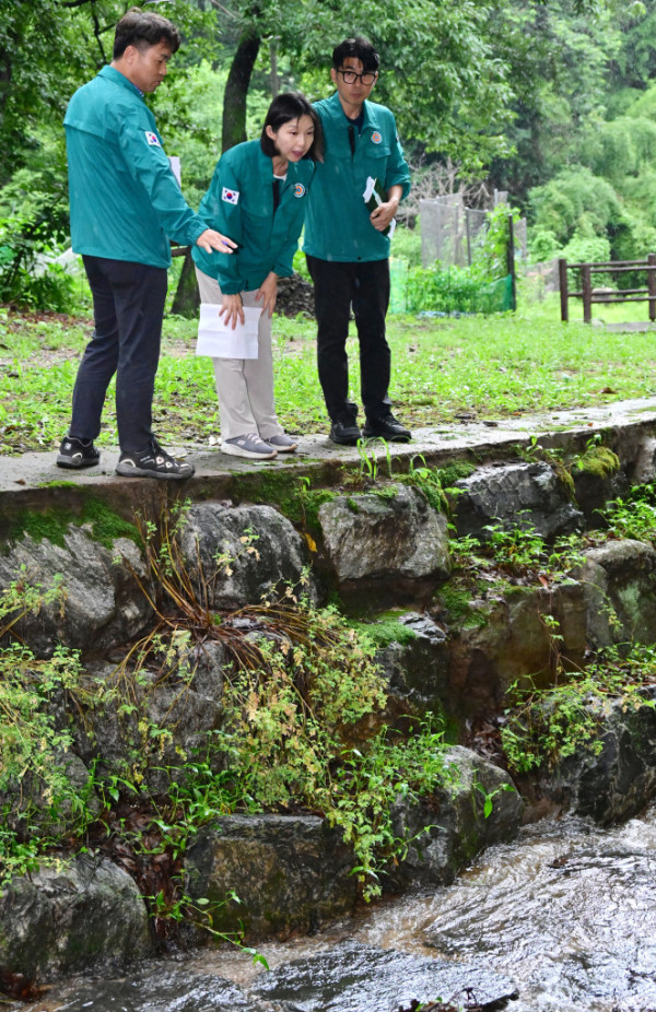 ▲최호정(가운데) 서울시의회 의장이 17일 집중호우에 대비해 우면산 일대 취약 지역을 점검하고 있다. (사진제공=서울시의회)