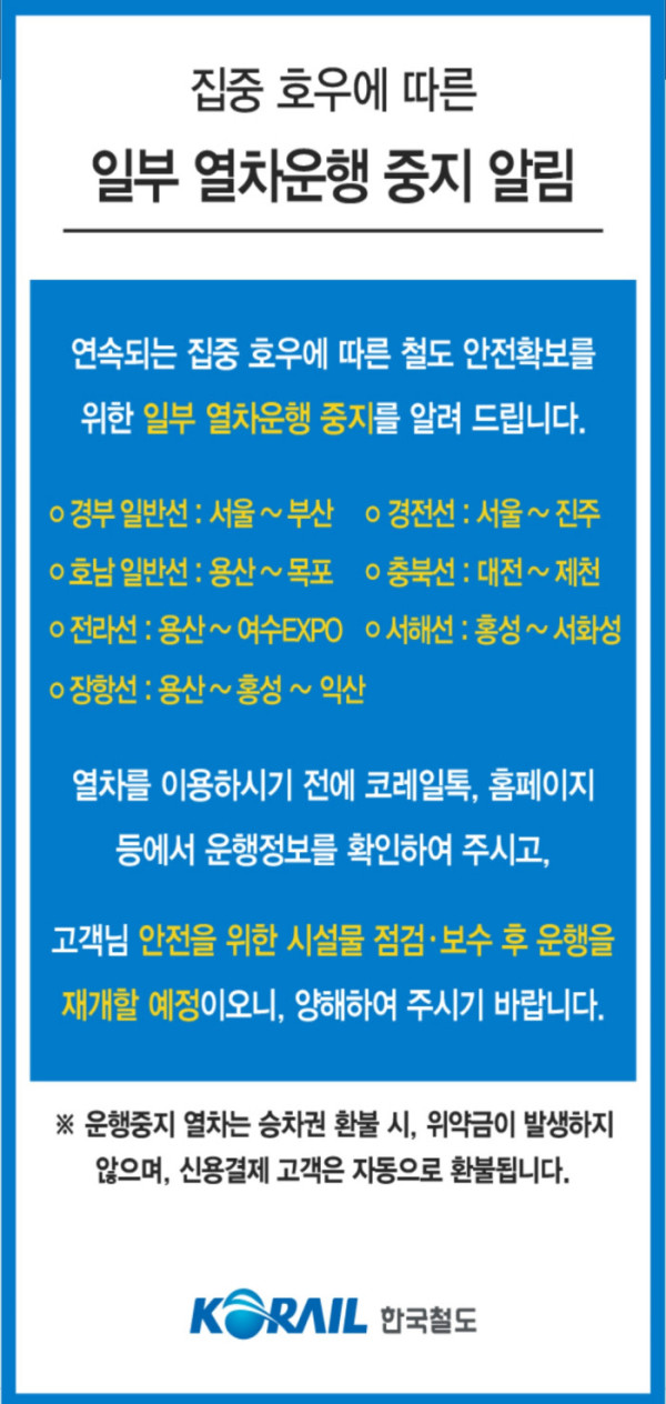 18일 오전 극한 호우로 인해 전국 곳곳 철도 운행이 중단됐다. 코레일에 따르면 경부 일반선(서울~부산), 경전선(서울~진주), 호남 일반선(용산~목포), 충북선(대전~제천), 전라선(용산~여수EXPO), 서해선(홍성~서화성), 장항선(용산~홍성~익산) 열차가 중단됐다. 다만 KTX는 경부선 전 구간에서 운행 중이다. 이외 남부지역은 KTX 포함 전면 운행 중지다. 침수 피해가 큰 전동∼전의 구간은 복구에 장시간이 걸릴 전망이다.