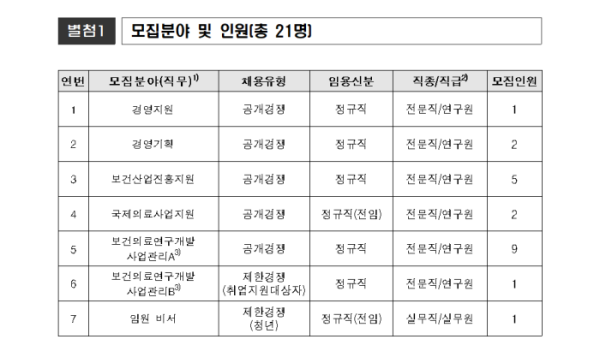 모집분야는 경영지원, 기획, 보건산업진흥, 국제의료, 연구개발사업관리 등 7개이며 보훈대상자와 청년을 위한 제한경쟁도 병행된다.