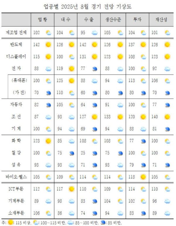 세부 업종별로는 반도체(142), 디스플레이(115), 화학(123), 바이오·헬스(105) 등이 ‘맑음’ 수준의 고점을 기록한 반면, 가전(70), 조선(87), 자동차(82), 섬유(93)는 기준선 아래에서 부진한 흐름을 이어갔다.