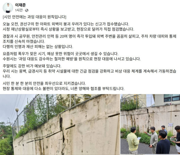 이 시장은 현장 점검 직후 개인 SNS를 통해 “폭우가 잦은 시기에는 예상추 못한 위험이 언제든 발생할 수 있다”며 “수원시는 과잉대응도 감수하며 시민 생명과 안전을 지키는 데 최선을 다하고 있다”고 밝혔다.