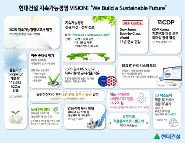 현대건설은 지속가능경영을 위한 노력과 성과, 신규 전략과 실행 과제 등을 담은 2025 지속가능경영보고서를 발행했다고 21일 밝혔다.