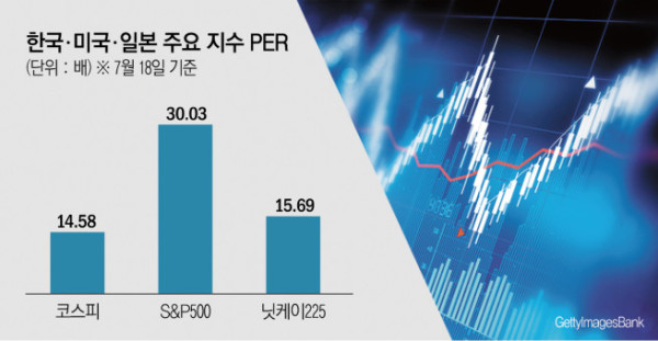 그러나 미국, 일본 등 주요국 증시 대표 지수에 매겨진 가치에 비하면 코스피는 여전히 저렴한 수준이다. 같은 날 기준 스탠더드앤드푸어스(S&P)500 지수의 PER과 PBR은 각각 30.03배, 5.36배로 나타났다. 코스피 PER과 PBR은 S&P500의 49%, 20% 수준에 그친다. 니케이225 지수 PER과 PBR도 각각 15.69배, 1.42배로 코스피를 웃돈다. 국내 증시가 절대적 저평가 위치에 있다는 뜻이다.