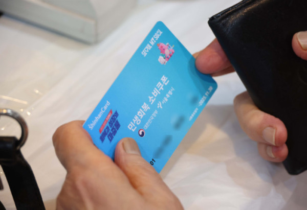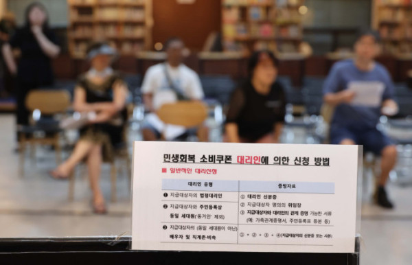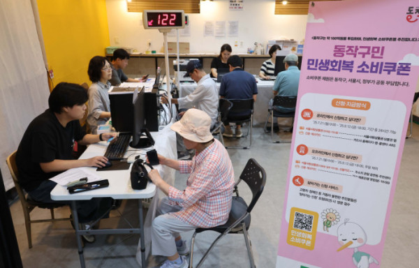 민생회복 소비쿠폰 신청이 시작된 21일 서울 동작구 대방동주민센터 작은도서관에서 시민들이 소비쿠폰 신청을 하고 있다.