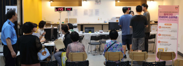 ▲민생회복 소비쿠폰 신청이 시작된 21일 서울 동작구 대방동주민센터 작은도서관에서 시민들이 소비쿠폰 신청 순서를 기다리고 있다. 신태현 기자 holjjak@
