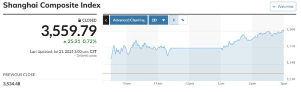 상하이종합지수는 전 거래일 대비 25.21포인트(0.72%) 오르며 상승 마감했다. 종가는 3559.79이었다. 대만 증시 자취안 지수는 이날 전 거래일 대비 64.77포인트(0.28%) 올라 2만3340.56에 거래를 마쳤다.