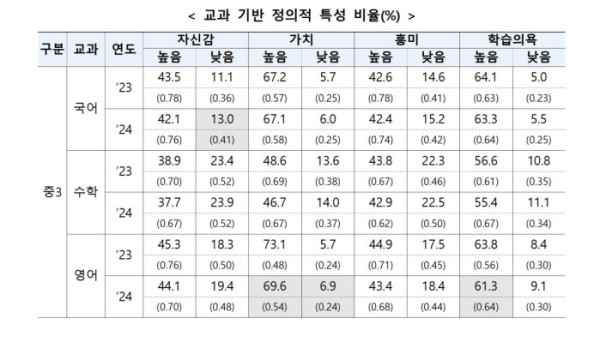 그러나 교과에 대한 학생들의 자신감과 흥미는 오히려 후퇴한 것으로 나타났다. 중3 학생의 경우 국어 교과에 대해 자신감이 낮다고 응답한 비율이 2023년 11.1%에서 지난해 13.0%로 늘었다. 영어 교과에 대해 가치가 높다고 응답한 비율은 전년 대비 3.5%p, 학습의욕이 높다는 비율은 2.5%p 낮아졌다.