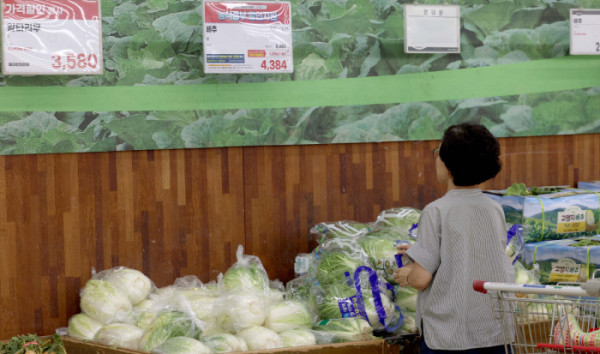 ▲생산자물가가 석 달 만에 상승했다. 주로 농림수산품이 올라 최근 폭우·폭염 영향과 더불어 밥상물가를 밀어올릴 가능성이 우려된다. 22일 한국은행에 따르면 6월 생산자물가지수는 119.77로 전월(119.64) 대비 0.1% 상승했다. 생산자물가는 지난 2~3월 강보합 수준을 나타내다 4월(-0.2%), 5월(-0.4%) 하락한 이후 3개월 만에 상승세로 돌아섰다. 특히 농림수산품 상승률이 전월 대비 0.6%로 높게 나타났다. 구체적으로 배추(31.1%), 돼지고기(9.5%), 달걀(4.4%), 쌀(3.4%) 등의 품목이 높은 상승률을 기록했다. 이날 서울의 한 대형마트에 배추가 진열돼 있다. 신태현 기자 holjjak@