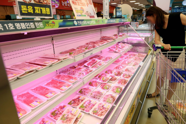 ▲생산자물가가 석 달 만에 상승했다. 주로 농림수산품이 올라 최근 폭우·폭염 영향과 더불어 밥상물가를 밀어올릴 가능성이 우려된다. 22일 한국은행에 따르면 6월 생산자물가지수는 119.77로 전월(119.64) 대비 0.1% 상승했다. 생산자물가는 지난 2~3월 강보합 수준을 나타내다 4월(-0.2%), 5월(-0.4%) 하락한 이후 3개월 만에 상승세로 돌아섰다. 특히 농림수산품 상승률이 전월 대비 0.6%로 높게 나타났다. 구체적으로 배추(31.1%), 돼지고기(9.5%), 달걀(4.4%), 쌀(3.4%) 등의 품목이 높은 상승률을 기록했다. 이날 서울의 한 대형마트에 돼지고기가 진열돼 있다. 신태현 기자 holjjak@